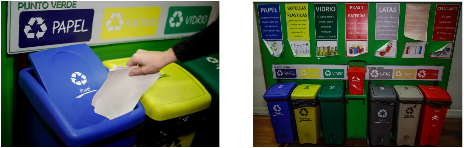- Instalación de puntos verdes o contenedores para reciclaje de materiales (papel, cartón, vidrio, plásticos, latas, pilas y baterías, Tetrapak y celulares), y gestión de residuos de dichos materiales.