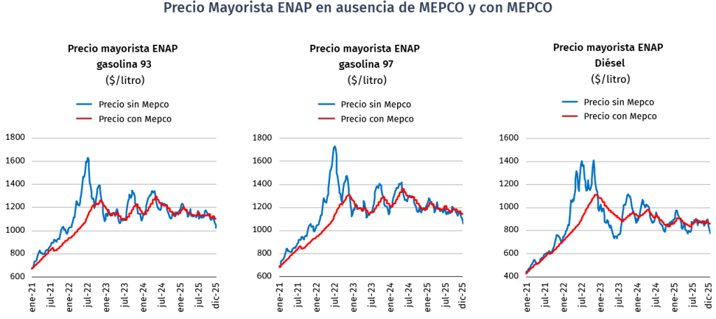 El MEPCO fue creado por la ley Nº 20.765 publicada el 09 de julio del 2014, con la finalidad de establecer un mecanismo de estabilización de los precios de venta internos de la gasolina automotriz, del petróleo diésel, del gas licuado de petróleo y del gas natural comprimido, ambos, estos últimos, de consumo vehicular. Dicho mecanismo opera a través de incrementos y rebajas a los impuestos específicos a los combustibles establecidos en la ley N° 18.502, según lo establecido en el Decreto Supremo Nº 1.119, de 2014, del Ministerio de Hacienda, que aprueba reglamento para la aplicación del MEPCO.